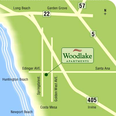 Woodlake Apartments 6100 Edinger Avenue Huntington Beach, CA 92647 For Leasing Information, please contact P.A. Poon & Son, Inc. at (714) 965.6010. Directions from Los Angeles County 405 Fwy South take the SPRINGDALE ST./ WESTMINSTER AVE exit. Keep RIGHT at the fork in the ramp. Turn RIGHT onto SPRINGDALE ST. Turn LEFT onto EDINGER AVE. Directions from San Diego County 405 Fwy North take the BOLSA AVE exit towards GOLDEN WEST ST. Merge onto BOLSA AVE. Turn LEFT onto GOLDENWEST ST. Turn RIGHT onto EDINGER AVE. |